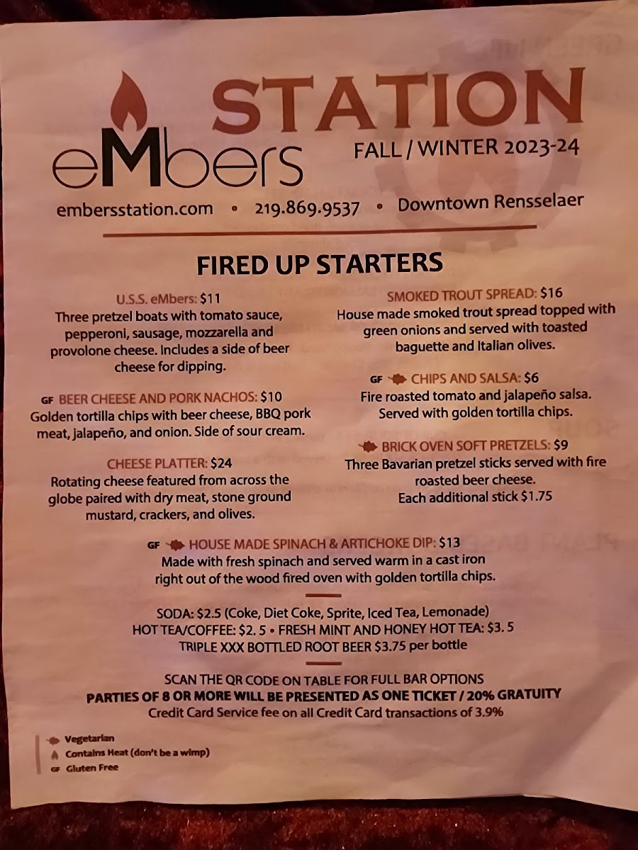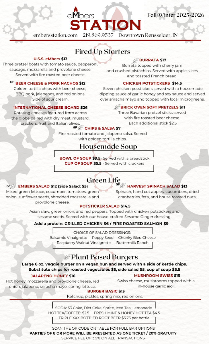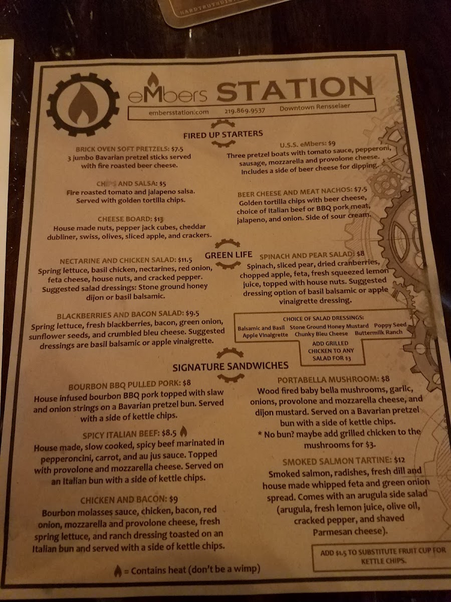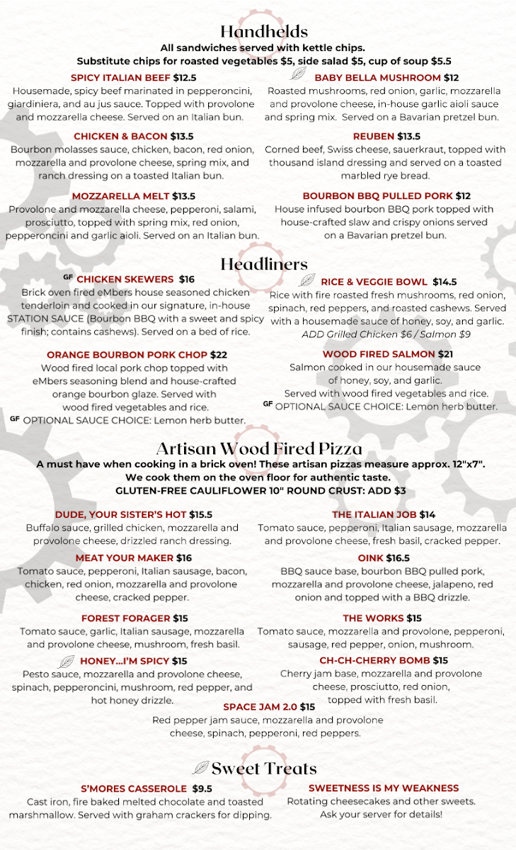 From a reviewer’s perspective, the menu at Embers Station Bistro & Bar feels like a confident summary of the restaurant’s identity-approachable, creative, and built around bold, satisfying flavors. It opens strong with starters like U.S.S. Embers, Chicken Potstickers, Brick Oven Soft Pretzels, Beer Cheese & Pork Nachos, and Chips & Salsa, which set a casual yet indulgent tone. The Wood Fired Pizza selection stands out as a centerpiece, with inventive options such as Ch-Ch-Cherry Bomb, Forest Forager, The Italian Job Dude, Your Sister’s Hot!, and Meat Your Maker, showcasing the kitchen’s flair for combining heat, smoke, and rich toppings. For something lighter but still flavorful, the Salad - Green Life section offers Potsticker Salad, Harvest Spinach Salad, Embers House Salad, and Embers House Side Salad, balancing freshness with hearty ingredients. The Handhelds-including Bourbon BBQ Pulled Pork, Mozzarella Melt, Chicken & Bacon Baby Bella Mushroom, and Spicy Italian Beef-deliver comfort food appeal, while the Plant Based Burgers like Mushroom Swiss, Jalapeño Honey, and Burger Basic ensure that vegetarian diners are just as well served. Moving into the mains, the Headliners such as Orange Bourbon Pork Chop, Wood Fired Salmon, and Rice And Veggie Bowl highlight the restaurant’s ability to elevate simple concepts into memorable plates. Even the Sides, from Beer Cheese to Fire Roasted Veggies, feel thoughtfully chosen rather than like afterthoughts. To finish on a sweet note, the S’mores Casserole With Graham Crackers To Dip provides a playful, shareable dessert, while simple drink options like Canned Coke, Canned Sprite, and Canned Diet Coke keep things straightforward. Overall, the menu comes together as a cohesive, well-rounded offering that reflects Embers Station Bistro & Bar’s commitment to comfort, creativity, and crowd-pleasing variety.