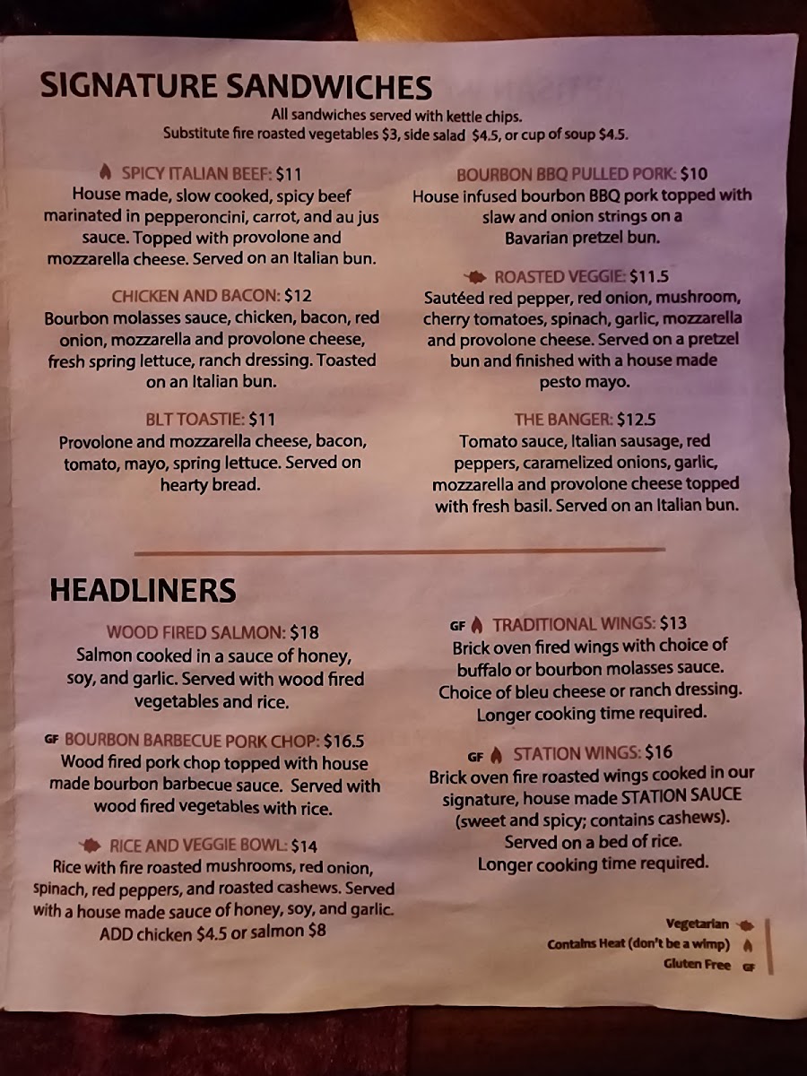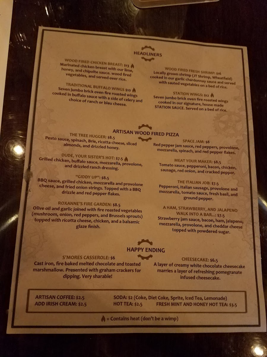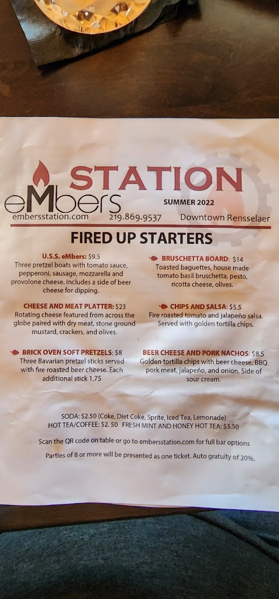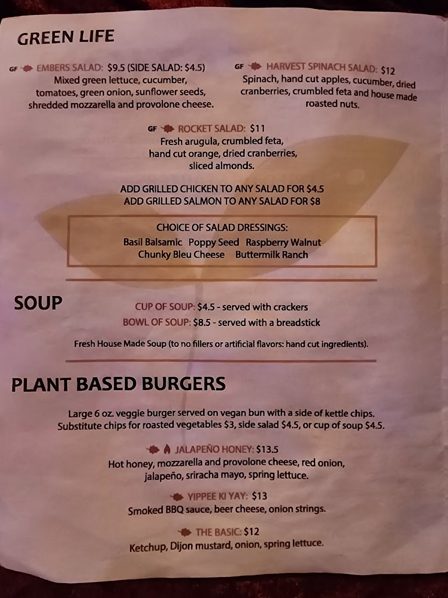 From a reviewer’s perspective, the menu at Embers Station Bistro & Bar feels like a confident summary of the restaurant’s identity-approachable, creative, and built around bold, satisfying flavors. It opens strong with starters like U.S.S. Embers, Chicken Potstickers, Brick Oven Soft Pretzels, Beer Cheese & Pork Nachos, and Chips & Salsa, which set a casual yet indulgent tone. The Wood Fired Pizza selection stands out as a centerpiece, with inventive options such as Ch-Ch-Cherry Bomb, Forest Forager, The Italian Job Dude, Your Sister’s Hot!, and Meat Your Maker, showcasing the kitchen’s flair for combining heat, smoke, and rich toppings. For something lighter but still flavorful, the Salad - Green Life section offers Potsticker Salad, Harvest Spinach Salad, Embers House Salad, and Embers House Side Salad, balancing freshness with hearty ingredients. The Handhelds-including Bourbon BBQ Pulled Pork, Mozzarella Melt, Chicken & Bacon Baby Bella Mushroom, and Spicy Italian Beef-deliver comfort food appeal, while the Plant Based Burgers like Mushroom Swiss, Jalapeño Honey, and Burger Basic ensure that vegetarian diners are just as well served. Moving into the mains, the Headliners such as Orange Bourbon Pork Chop, Wood Fired Salmon, and Rice And Veggie Bowl highlight the restaurant’s ability to elevate simple concepts into memorable plates. Even the Sides, from Beer Cheese to Fire Roasted Veggies, feel thoughtfully chosen rather than like afterthoughts. To finish on a sweet note, the S’mores Casserole With Graham Crackers To Dip provides a playful, shareable dessert, while simple drink options like Canned Coke, Canned Sprite, and Canned Diet Coke keep things straightforward. Overall, the menu comes together as a cohesive, well-rounded offering that reflects Embers Station Bistro & Bar’s commitment to comfort, creativity, and crowd-pleasing variety.